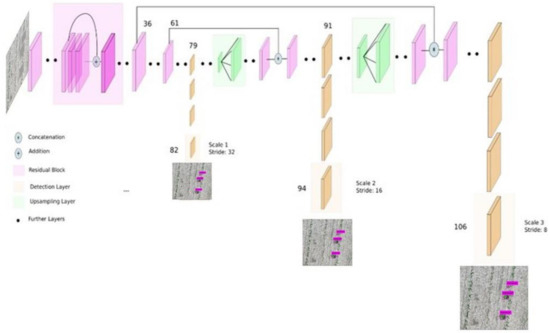 54]. In total, YOLOv3 consists of 106 layers. The initial 53 layers are called the network’s backbone, while the latter 53 are called the detection layers. An illustration of the YOLOv3 architecture is shown in