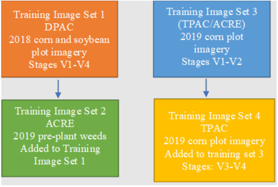 Table 1. While configuring Training Image Set 4, early growth-stage corn plot imagery was acquired at 10 m AGL. No imagery was acquired from soybean plots during this time. Within these images, corn had fully emerged, and it was easier to decipher between weeds and crops. The criteria for identifying emerged corn included a longer average leaf length, larger average leaf diameter, a succinct spacing of corn plants based on planting pattern, and other physical traits, such as leaf structure [