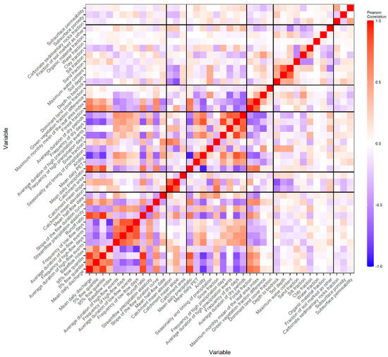 To better understand what Figure 1 depicts, we here note that variables were sorted according to their type (in both the horizontal and vertical directions); see Table A1. As regards the horizontal direction, hydrological signatures are placed in the bottom-left corner of Figure 1, being followed by climatic indices and the remaining types of variables (as we move from the left to the right). Some hydrological signatures are highly correlated (e.g., mean daily discharge, 5% flow quantile, 95% flow quantile and baseflow index). This does not pose problems for our approach, because hydrological signatures are modelled separately.