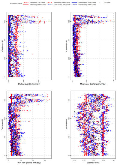 Here we present probabilistic predictions of signatures related to discharge volumes, i.e., mean daily discharge, 5% flow quantile, 95% flow quantile and baseflow index at quantile levels 2.5%, 50.0% and 95.0% in a 10-fold cross-validation procedure for the full sample of catchments. Similar analysis for the remaining signatures is presented in Section 3.3 and Section 3.4. Values of the variables are presented in Figure A1, while probabilistic predictions are presented in Figure 2. Two cases are examined, i.e., boosting with linear models as base learners and boosting with a combination of linear models and stumps as base learners. We note that 5% and 95% flow quantiles should not be confused with their 2.5%, 50.0% and 97.5% prediction quantiles. In particular, the problem is set so as to provide 2.5%, 50.0% and 97.5% prediction quantiles for 5% and 95% flow quantile hydrological signatures.