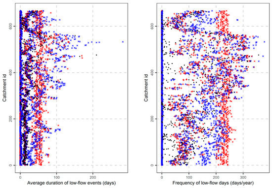 Maps of values of high-flow events, frequency of high flow events, average duration of low-flow events and frequency of low-flow days are presented in Figure A2, while the respective probabilistic predictions are presented in Figure 3. Similar results as those reported in Section 3.2 regarding the comparison between the two implemented algorithms also hold here in the 10-fold cross-validation. In particular, signatures are well predicted by both algorithms, while prediction intervals contain the observed values. Boosting with linear models and stumps as base learners seems to be less variable at the 97.5% quantile level while the truncation effect at 0 is also evident.