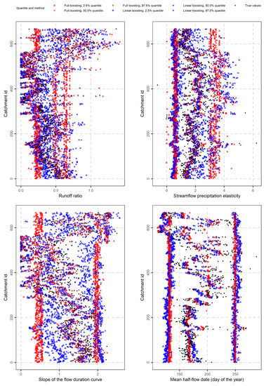 Regarding prediction performances, model (a) provided better predictions at quantile levels 2.5% and 97.5%, while model (b) showed better performance in providing predictions at quantile level 50.0% (i.e., better point predictions). Boosting models can be more interpretable compared to other machine learning regression algorithms. By exploiting this latter property of theirs, we found that climatic indices and topographic characteristics are better predictors of hydrological signatures than characteristics of other types.