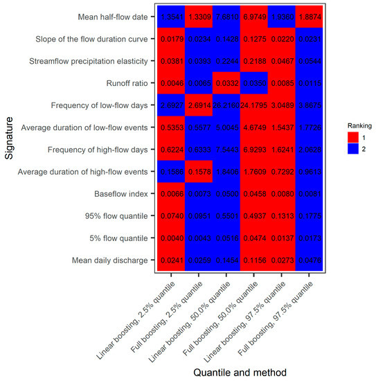 Average quantile losses when predicting hydrological signatures at quantile levels 2.5%, 50.0% and 97.5% for statistical boosting with linear models as base learners (see “linear boosting” in the horizontal axis), and combination of linear models and stumps as base learners (see “full boosting” in the horizontal axis). Rankings of methods per quantile level at each hydrological signature are also reported.