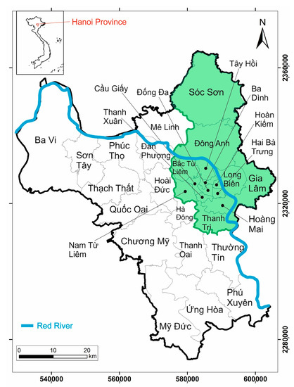 In 2008, the administrative boundary was enlarged to more than three times its previous size and the Hanoi Province now encompasses an area of 3342.92 km2 and 30 subdivisions (29 districts and 1 town; Figure 1). Three years later, Hanoi’s lead planners (Hanoi People’s Committee and the Vietnamese Ministry of Construction), together with international consultancies, developed the Hanoi Capital Construction Master Plan (HCCMP). The latter is a framework to guide the city’s sustainable development to 2030 in sectors like transportation, access to clean water, sanitation and housing and to establish a socio-economic vision until 2050 [20]. Under the HCCMP, about 28% of the natural land in 2011 will be converted to built-up land to accommodate the rising urban population of Hanoi, projected to increase to ~9.2 million by 2030 [21]. As a result of the higher demands for housing and infrastructure, the amount of land that is built upon in the Province is projected to rise sharply, by almost three times, from 463.4 km2 in 2011 to more than 1295 km2 by 2030 [22]. Consequently, there is an urgent need for urban planners and local authorities to monitor and regulate the upcoming urbanization and its environmental impact. The increase in urban development will indeed require additional quantities of raw materials, such as construction aggregates, cement, bricks and steel, whose extraction and manufacture can have negative effects on the surrounding environment. In addition, if an adequate supply of materials is not maintained, the ability to implement planed urban growth can be negatively impacted.
