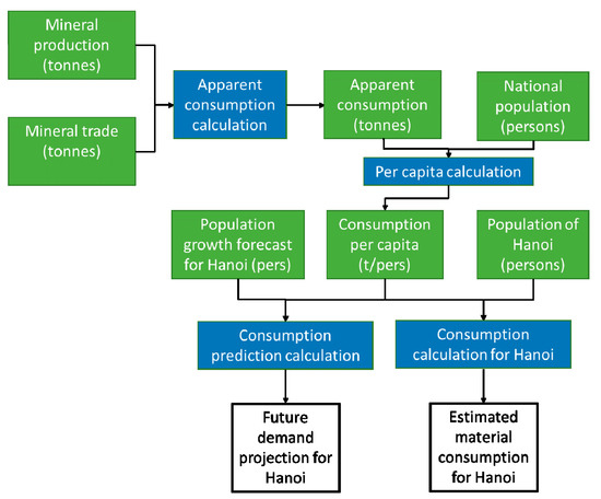 The publically available data at a province level resolution has been used to analyse past construction material demand and supply in Hanoi, following the so-called ‘top-down’ approach [42]. Additional information has been extracted from downscaling data from the national level statistics to province level, albeit based on some assumptions. These calculations can then be projected forward using forecasted information for population growth. The datasets utilised in the analysis of current and future construction materials for the Hanoi Province in this study were: