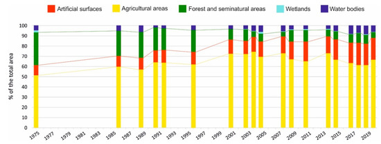 Temporally, the largest change in LULC is related to the increase in artificial surfaces from 9.8% of the Province in 1975 to 21.4% in 2020 at the expense of forest and seminatural areas whose size has fallen from 32.5% in 1975 to 5.8% in 2020. The increase in artificial surfaces between the beginning of the 1990s and 2010s is >200 km2 in agreement with values reported in [28] for the same interval. Agricultural areas have always represented the majority of the LULC with a sharp increase from 51% in 1975 to >70% during the 1980s and 1990s and then a gradual decline to 66.5% in 2020 (Figure 4).