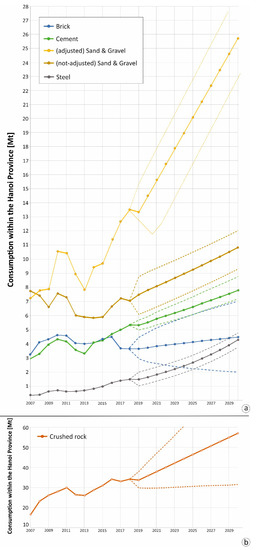 Projections and confidence intervals (dotted lines) for consumption of construction materials within the Hanoi Province for bricks, cement, (adjusted) sand and gravel, (not-adjusted) sand and gravel and steel (a) and crushed rock aggregates (b). Note: a different scale for the consumption projection of crushd rock is used.