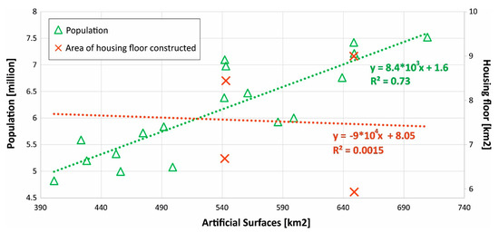 - Areas of artificial areas (km2) vs area of housing floors constructed (m2) between 1996 and 2018 (excluding 1997, 2002, 2010, 2012 and 2016).