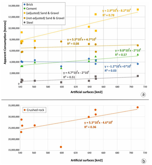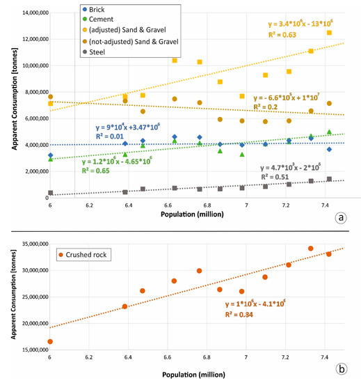 The aim of this study is to analyse the relationship between LULC and population- and economic-datasets during the 2007–2018 interval. Such a holistic approach provides opportunities to quantify the consumption of resources associated with the past and current infrastructure development like transport units and buildings. This information enables national and local authorities to understand the volumes associated with the current use of construction materials and to plan and design effective policies and strategies for future extraction and use of mineral resources, reducing negative environmental impacts and ensuring the security of supply.