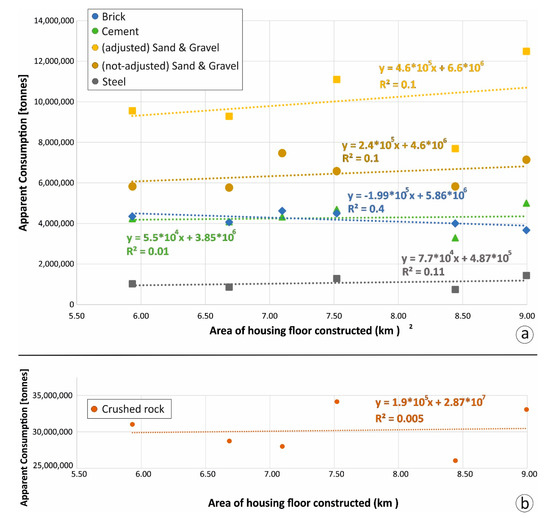 Combining the satellite data (spatial) with material AC, population and construction of housing floors data firstly requires that datasets be converted to the same spatial or temporal reference system. The material apparent consumption and the other data mentioned in Section 3.2 are not available as a geospatial dataset and consequently only a temporal comparison has been possible.
