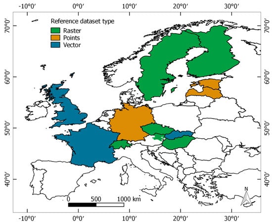 The overview of the available national datasets is given in Figure 1 and details are listed in Table 1. Generally, the pre-processing of these datasets included resampling to the Equi7 grid (10 m resolution) [32] in the case of raster datasets and rasterization for the vector dataset. Due to the limited accessibility of the data in some countries, validation over Germany, Latvia and Estonia was performed point-wise using randomly selected points from respective NFIs or forest management inventories data. In cases where the dataset contained more detailed classes such as dominant tree species, the classes were adapted to coniferous (at least 65% of the coniferous tree species), broadleaved (at least 65% of broadleaf tree species) or mixed forest. The mixed forest class was used for forest/non-forest validation only. Details specific to the national datasets including the source of the data (e.g., in-situ, satellite or aerial imagery) can be found in the Appendix A.