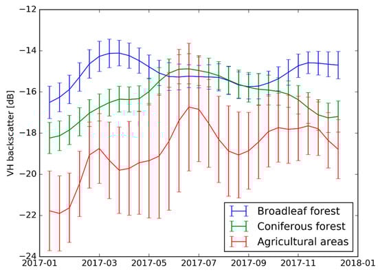 Cross-polarized (VH) backscatter temporal signatures of various vegetation types: agricultural areas (all crop types), broadleaf (dominant tree type—oak) and coniferous (dominant tree type—spruce) forests. The average values (solid line) are computed as averages of 1000 randomly selected pixels for each class in area in central Europe, the error bars represent the standard variation of the backscatter value for each time stamp.
