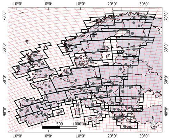 Overview of the regions used for the Sentinel-1 forest maps computation (black lines) and the locations of their respective signature prototypes (grey points) across Europe. Red lines indicate the Equi7 grid tiling.