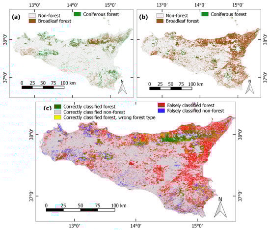 Detailed forest type map over Sicily from (a) Sentinel-1, (b) Copernicus High Resolution Layers and (c) the difference map between the two datasets.