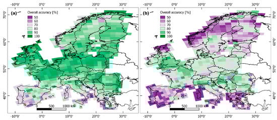 Overall accuracy of the Sentinel-1 (a) forest/non-forest and (b) forest type map computed for each Equi-1 tile. The Copernicus High Resolution Layers forest type dataset was used as a reference, showing the limitations of the presented maps for high latitudes and Mediterranean forests. Lower accuracies can also be observed in mountainous areas.