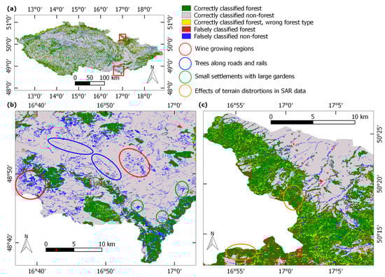 Common reasons of disagreement between the Sentinel-1 and reference Copernicus High Resolution Layers forest maps (Indicated by ellipses). (a) Difference map between the Sentinel-1 and Copernicus forest type map over Czech Republic, (b) detail of the difference map over area in flatland and (c) detail of the difference map over area in mountains.
