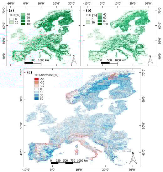 Overview of the tree cover density (TCD) maps from (a) Sentinel-1, (b) Copernicus High Resolution Layers (HRL) and (c) the difference map between the two datasets (Copernicus HRL map was subtracted from Sentinel-1 TCD map).
