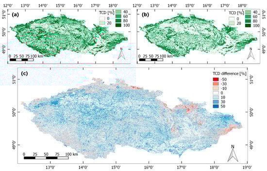 Detailed tree cover density (TCD) maps of the Czech Republic from (a) Sentinel-1, (b) Copernicus High Resolution Layers (HRL) and (c) the difference map between the two datasets (Copernicus HRL map was subtracted from Sentinel-1 TCD map).