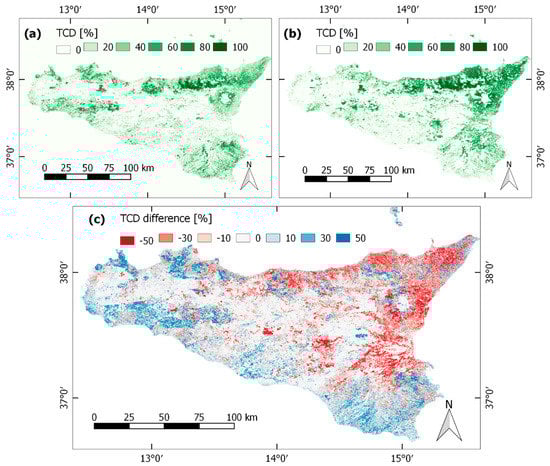 Detailed tree cover density (TCD) maps over Sicily from (a) Sentinel-1, (b) Copernicus High Resolution Layers (HRL) and (c) the difference map between the two datasets (Copernicus HRM map was subtracted from Sentinel-1 TCD map).