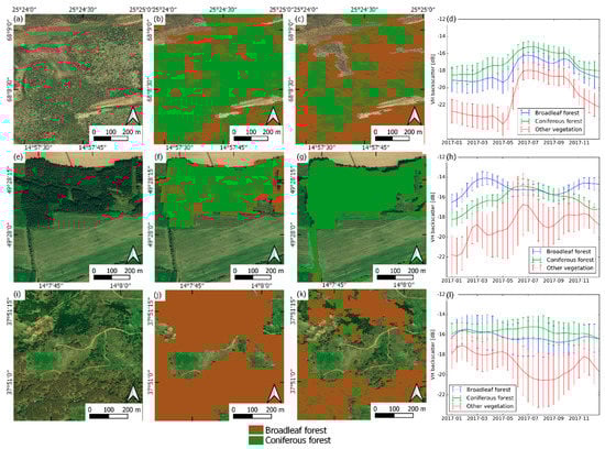 Examples of the forest type maps and cross-polarized backscatter temporal signatures from areas in northern Finland (boreal forest), Czech Republic (temperate forest) and Sicily (Mediterranean forest). The Bing aerial imagery is used as a base map. Temporal signatures are computed from sample of 1000 randomly selected points within a single Equi7 tile for classes coniferous forest, broadleaf forest and other vegetated areas. The solid line indicates the average backscatter value while the error bars indicate its standard deviation for each time stamp. (a) to (d) show subset in northern Finland where (a) shows Bing aerial image (b) Copernicus High Resolution Layers (HRL) forest type map, (c) Sentinel-1 forest type map and (d) temporal signature of the three vegetation classes. (e) to (h) show subset in Czech Republic where (e) shows Bing aerial image (f) Copernicus HRL forest type map, (g) Sentinel-1 forest type map and (h) temporal signature of the three vegetation classes. (i) to (l) show subset in Sicily where (i) shows Bing aerial image, (j) Copernicus HRL forest type map, (k) Sentinel-1 forest type map and (l) temporal signature of the three vegetation classes.