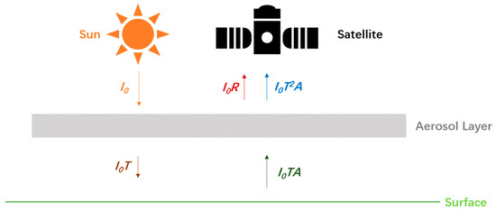 To derive our fast and simple atmospheric solar 1-D radiative transfer model, we need to consider that a sensor is above the TOA looking down toward the surface in the case of normal illumination where 3-D effects (i.e., horizontal transport of photons) and polarization are ignored. We use the propagation of error approach [61] to quantify the uncertainty of aerosol optical depth concerning the uncertainty of surface albedo (A), single scattering albedo of aerosols (SSA), and asymmetry parameter (g). Here A, SSA, and g are independent variables (neglecting their correlations for simplicity). Our model makes simplifying assumptions: (1) the atmosphere is one-dimensional, and it varies only in the vertical direction while horizontal variations are neglected; (2) the aerosol layer is infinitesimally thin and is in a plane-parallel, uniform atmosphere under clear-sky conditions; (3) both Rayleigh (e.g., at 660 nm, ~0.04) and aerosol optical depth (<0.1) are far less than unity, which requires the aerosol layer to be optically thin enough so that the single-scattering approximation is valid.