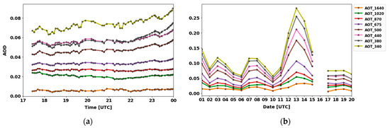 (a) Time series of spectral AOD measurements (AERONET Level 1.5) at the UNR site (39.541°N, 119.814°W) on 17 October 2019 (left); (b) Time series of spectral AOD measurements at the UNR site during 2019 October at wavelengths from 340 nm to 1640 nm (right).