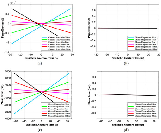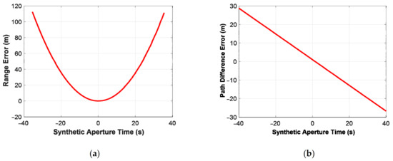 However, due to the high orbit, the synthetic aperture time of multistatic GEO SAR is several hundred seconds or even more. The employment of a traditional linear trajectory model will produce significant errors. According to the parameters in Table 3, the accurate slant range of GEO SAR can be obtained by a systems tool kit (STK), which can provide the time-dynamic position and attitude of the satellite. Compared with the accurate slant range, the traditional range model’s error (Equation (11)) can reach 112 m, as shown in Figure 5a.