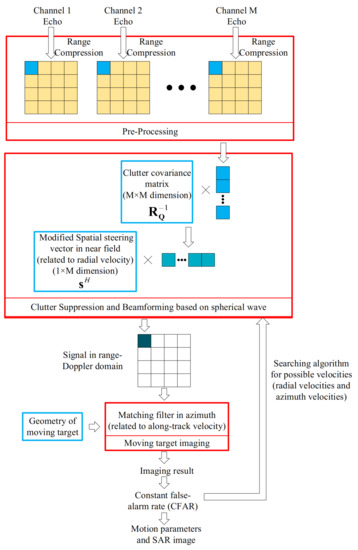 The traditional ISTAP constructs adaptive filters based on the multi-channel signal model under the far-field assumption and equivalent straight-line model, which cannot be applied to the multistatic GEO SAR. To solve these problems, a modified ISTAP considering the curved trajectory and near-field effects is proposed, whose flowchart is shown in Figure 6. Firstly, the multi-channel echo signals from several satellites are obtained. The echo signals are transformed into the range-Doppler domain based on the high-order signal model. Next, to achieve clutter suppression and beamforming, an adaptive filter is constructed by utilizing the covariance matrix of clutter and the modified spatial steering vector in the near field. The moving target imaging is then achieved by the back-projection algorithm (BPA), modified by the motion parameters. Finally, the detection and parameter estimation of the moving target is completed by searching the maximum signal to clutter and noise ratio (SCNR) through the range of possible target velocities and comparing it with a threshold. At the same time, the image of the moving target is obtained. The detail of each step is explained below.