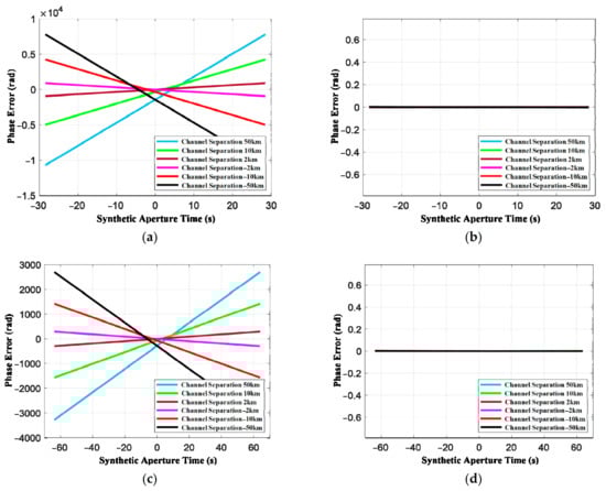 According to the signal model in Section 3.1 and Section 3.2, represents the radial velocity of the target. The coefficient is determined by the along-track baseline, which generates spatial sampling and forms a multi-degree freedom system. The multi-channel phase difference in Equation (25) can be categorized into four terms related to and . The multi-channel squint term is the constant phase, which is generated by the baseline. The Doppler shift term is caused by the along-track baseline. The along-track interferometric phase is related to the radial velocity of the target and along-track baseline. The near-field correction term is related to the high-order term of reference-channel range history and path difference.