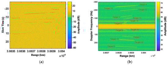 In the preprocessing step, the data from different channels are processed separately. Firstly, the data are compressed in ranges. Then, the targets’ offset between channels can be corrected for the compressed signal [33]. Moreover, the atmospheric phase of multistatic GEO SAR can be modeled according to the global Total Electron Content (TEC) information to compensate for the phase error [41,42,43]. Finally, the signal is transformed into the range-Doppler domain.