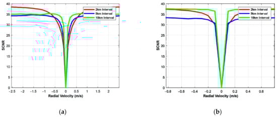 The minimum detectable velocity (MDV) under different conditions can be obtained from the output SCNR because the MDV is determined by the output SCNR’s detection threshold. It is considered that the moving target signal can be detected when the maximum allowable output SCNR loss is −5 dB [45].
