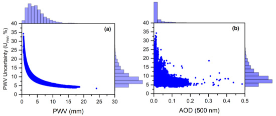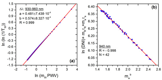 - Ingold, T.; Schmid, B.; Mätzler, C.; Demoulin, P.; Kämpfer, N. Modeled and empirical approaches for retrieving columnar water vapor from solar transmittance measurements in the 0.72, 0.82, and 0.94 μ absorption bands. J. Geophys. Res. Atmos. 2000, 105, 24327–24343. [Google Scholar] [CrossRef]