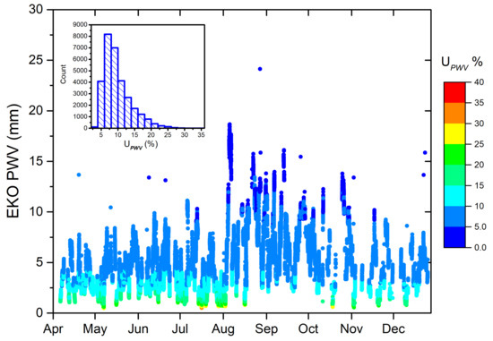 - Meteorological Radiosonde (RS92)Since June 2005, meteorological radiosondes are routinely launched twice daily, at ∼ 11:15 and ∼ 23:15 UTC at the Güimar station (28.32°N, 16.38°W, 105 m a.s.l.) situated at the coastline, approximately 15 km to the southeast of IZO at Tenerife island. This station is part of the Global Climate Observing System (GCOS)–Upper-Air Network (GUAN) (WMO GRUAN station #60018). Since 2008 the Vaisala RS-92 radiosondes corresponding to 12 UTC (hereafter, RS92) have been used.The PWV content in the atmosphere column is determined from the measured vertical profiles of temperature, relative humidity and atmospheric pressure acquired with the meteorological radiosondes [6]. The obtained PWV values have been post-corrected for radiation dependence (daytime radiosondes) and temperature following et al. [41]. The precision is 5% for total column water vapor in the lower and middle troposphere, increasing to between 10% and 20% in the upper troposphere for very dry conditions [6,25].