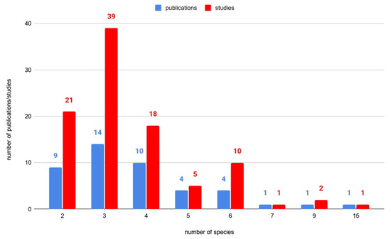 Most of the studies were conducted for the classification of three species (39 cases), followed by studies for two species (21 cases), four species (18 cases), six species (10 cases), and five species (5 cases). The classification results of seven, nine, and 15 species were conducted only in one publication each. The number of publications and studies grouped by the number of discriminated species is presented in Figure 1.