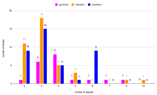 Of the reviewed publications, 39 studies were conducted equally for species classification using intensity+ features and waveform features, while only 19 studies were conducted on geometry features solely. The number of conducted studies, with their division into feature groups used to classify a specified number of discriminated species, is presented in Figure 2. The most common studies were processed to classify three species using intensity+ features (18 cases) and waveform features (15 cases).