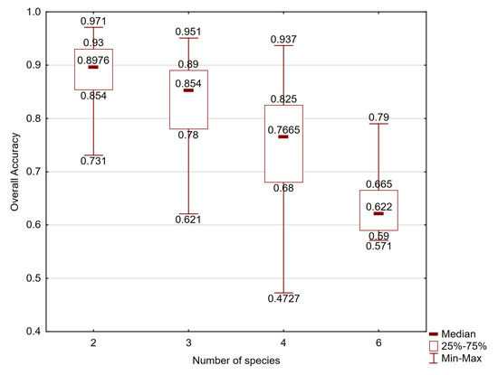 It should be noted that in general, the overall accuracy of species classification can be influenced by many factors, such as LiDAR data density, season of acquisition, number of discriminated species, approaches for tree delineation from the point cloud, sampling situations, features taken for the classification process, and so on. In this paper, the overall accuracies of all reviewed studies were compared only based on the number of discriminated species and the feature group that was taken for the species classification. Figure 3 presents the relationship between the overall accuracy and the number of classified species for studies where two, three, four, or six species were classified. Results for five, seven, nine, and 15 species were excluded, due to not being representative for statistical analysis. The overall accuracy of species classification declined with the number of classified species. This was similar to the relationship between NOCAI and the number of species, which is presented in Figure 4.