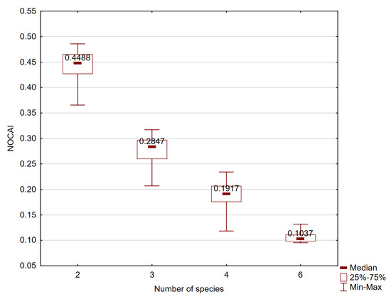 Relationship between NOCAI and the number of discriminated species in the reviewed studies.