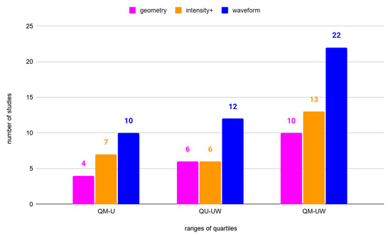 The number of studies with OA higher than median OA, grouped by feature groups (geometry, intensity+, waveform) used for classification with a division into the range of quartiles; QM-U—the range from the median to upper quartile, QU-U—the range from the upper quartile to the upper whisker, and QM-UW—the range from the median to the upper whisker.