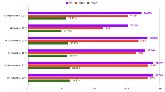 To compare the overall accuracy of classification generated when using the different feature groups, the most relevant studies of three species classification with calculated coefficient were analyzed. Figure 6 presents a comparison of the classification accuracy using the overall accuracy, coefficient, and NOCAI for the two most relevant studies of every feature group. Species classification using full-waveform features seemed to generate better results in general (OA = 95.0–95.1%, = 0.91–0.912, NOCAI = 31.67–31.70%) than geometry features (OA = 76.04–86.3%, = 0.84–0.82, NOCAI = 25.35–28.77%) and intensity features or their combination (OA = 90.80–89.00%, = 0.57–0.759, NOCAI = 29.67–30.27%), corresponding to the previous conclusion. It should be emphasized that the intensity+ group features also produced high accuracy in species discrimination.