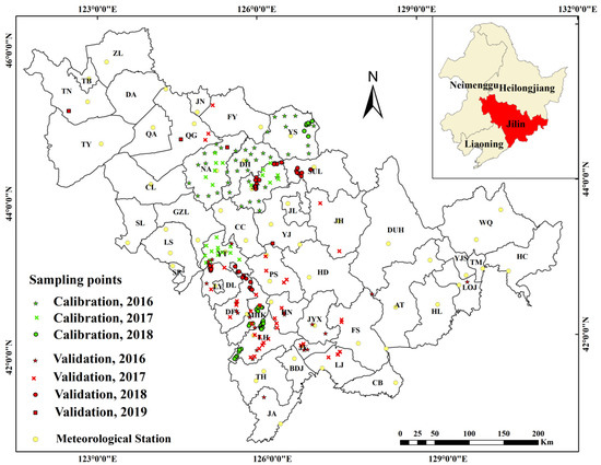The research area is located in Jilin province, northeastern China (40°52′–46°18′N, 121°38′–130°19′E), covering an area of 187,400 km2 (Figure 1). It has the highest elevation in the southeast at about 2000 m and drops gently to the northwest. Average temperature varies from 4.9 to 5.5 °C. The maximal temperature is up to 39.5 °C in July, while the lowest temperature can be at –39.8 °C in January. Total hours of sunlight per year vary from 2630 to 2930 h, and annual average precipitation ranges from 350 to >1500 mm in the southeast [37,38]. This region is part of the subhumid continental monsoon, where rain-fed spring maize is annually grown, sown at the end of April, and maturing at the beginning of October [38].