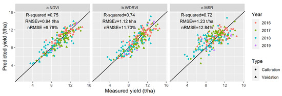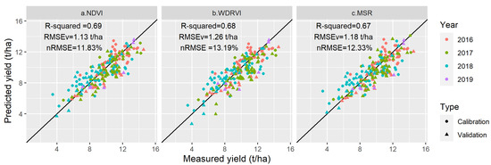 Relationships between measured and predicted yield under the MLR model using (a) NDVI, (b) WDRVI, and (c) MSR.
