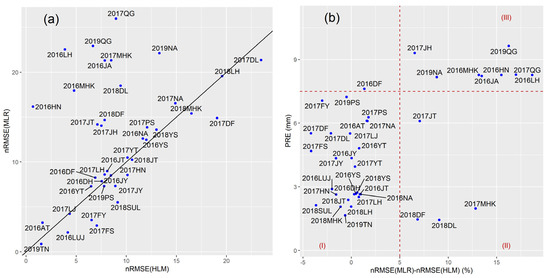 Relationship between the normalized root mean square error (nRMSE) of MLR and HLM, and precipitation. (a) The scatter diagram of nRMSE(MLR) and nRMSE(HLM) in different regions; (b) Relationship between PRE and difference between nRMSE(MLR)–nRMSE(HLM).