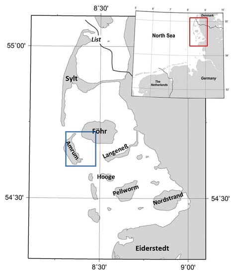 Area of interest (blue rectangle in the large map) on the German North Sea coast, east of the island of Amrum, and southwest of the island of Föhr.