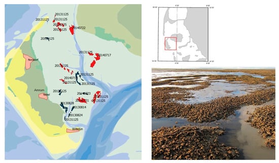 (Left): results from field campaigns carried out in 2013 and 2014. The labelled patches denote bivalve beds of blue mussels (blue) and oysters (red); (upper right): map showing the map location as red rectangle; (lower right): photograph (J. Kohlus) of bivalve beds showing the typical patchy distribution of elevated bivalves, water puddles, and sediments.