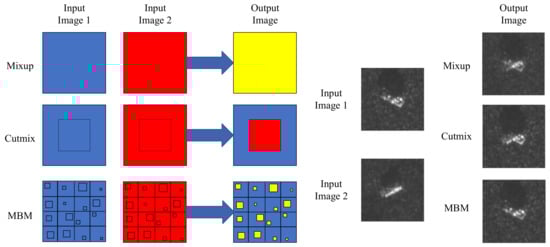 Mixup mixes the entire image, which makes the newly generated samples partially unclear and unnatural. Although cutmix generates natural images, a continuous area in the image is replaced with the content of other images. Considering that these two hybrid methods have corresponding shortcomings, our MBM method integrates and modifies them. In our proposed MBM method, matrix is also needed, . The difference with cutmix is that MBM randomly selects multiple rectangular boxes of different sizes in the matrix , sets the data of the rectangular boxes to 0, and sets the remaining areas to 1. Then, the new combination operation method is: