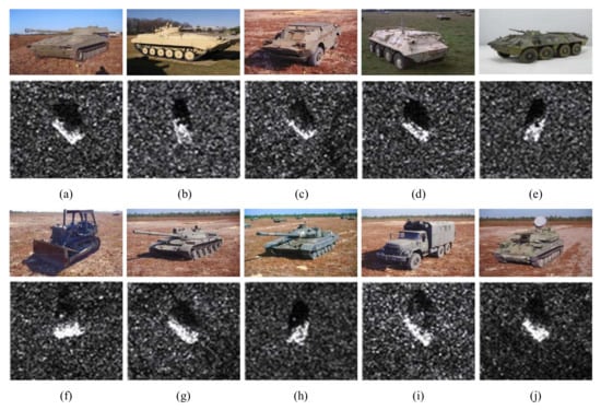 The MSTAR data set [] is a public data set created by the U.S. Air Force Laboratory, which consists of SAR images of ten classes of military vehicles with ground targets and is divided into two sub-datasets: a training data set and a testing data set. These ten class military vehicles include 2S1, BMP2, BRDM2, BTR60, BTR70, D7, T62, T72, ZIL131, and ZSU234, which are indexed by class labels 1, 2,…,10, respectively. The SAR and the corresponding optical images of each class are shown in Figure 3. The training images are obtained at a depression angle, and the testing images are captured at a depression angle. Each type of target is densely captured in aspect angles, ranging from to . The amount of each category is shown in Table 1.