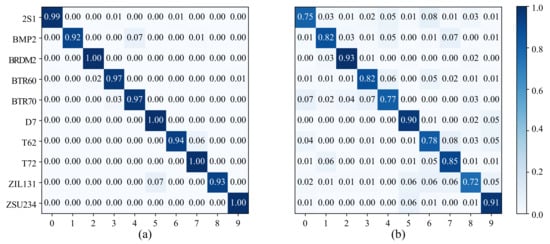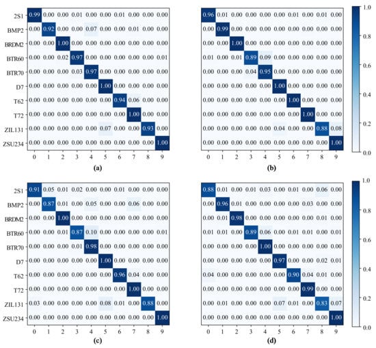 In the confusion matrices of Figure 4, their entries in the row and column indicate the proportion of samples in which the true label is the type and the predicted label is the type. From the confusion matrix in Figure 4, we can see that our MBM method can achieve 100% prediction recognition accuracy for four categories (i.e., BMRDM2, D7, T72, ZSU234). For the remaining categories, the recognition accuracy rate exceeded 90%, and the recognition accuracy of all categories was generally higher than that of the supervised learning method.
