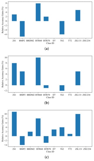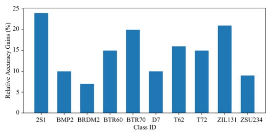 It can be clearly seen from Figure 5 that our MBM method improved the recognition accuracy of all categories by more than 5%. The improvement of BMP2 and ZSU234 was less than 10%, while the improvement of other categories was more than 10%. The improved recognition accuracy of 2S1 and ZIL131 exceeded 20%. In addition, the reason why ZSU234 was not much improved was that the recognition accuracy of the model obtained by the supervised method in the category exceeded 90%, while the improved recognition accuracy was 100%.