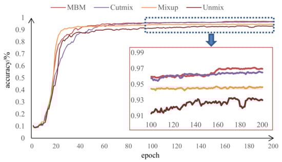 To directly compare the experimental results, we plot the recognition accuracy curves of the MBM, cutmix, mixup, and unmixed methods corresponding to 10 labeled samples per category, as shown in Figure 8. It is observed that the accuracy curve of the mixup method increases the fastest in the initial stage; the MBM method is relatively slow; and the cutmix method increases the slowest. The four kinds of curves are relatively stable after 60 epochs, and MBM obtains the highest recognition accuracy. This indicates that the three hybrid methods can improve the recognition accuracy of the model to a certain extent, and the mixup method can quickly improve the recognition rate in the initial stage. However, as the training process progresses, the training model can better extract the features of the mixed samples provided by the MBM and cutmix methods and achieve higher recognition accuracy. Compared with cutmix, MBM can obtain higher recognition accuracy.