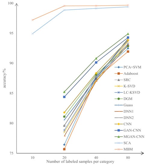 From Table 4, we see that our MBM method can obtain a higher recognition accuracy with a lower amount of labeled samples. The recognition accuracy is higher than all the other semi-supervised learning methods. Moreover, the recognition accuracy using only 10 labeled samples per category surpassed all other methods except the SCA method. This shows that our method has lower requirements for labeled samples than other semi-supervised learning methods and is more efficient in using unlabeled samples.